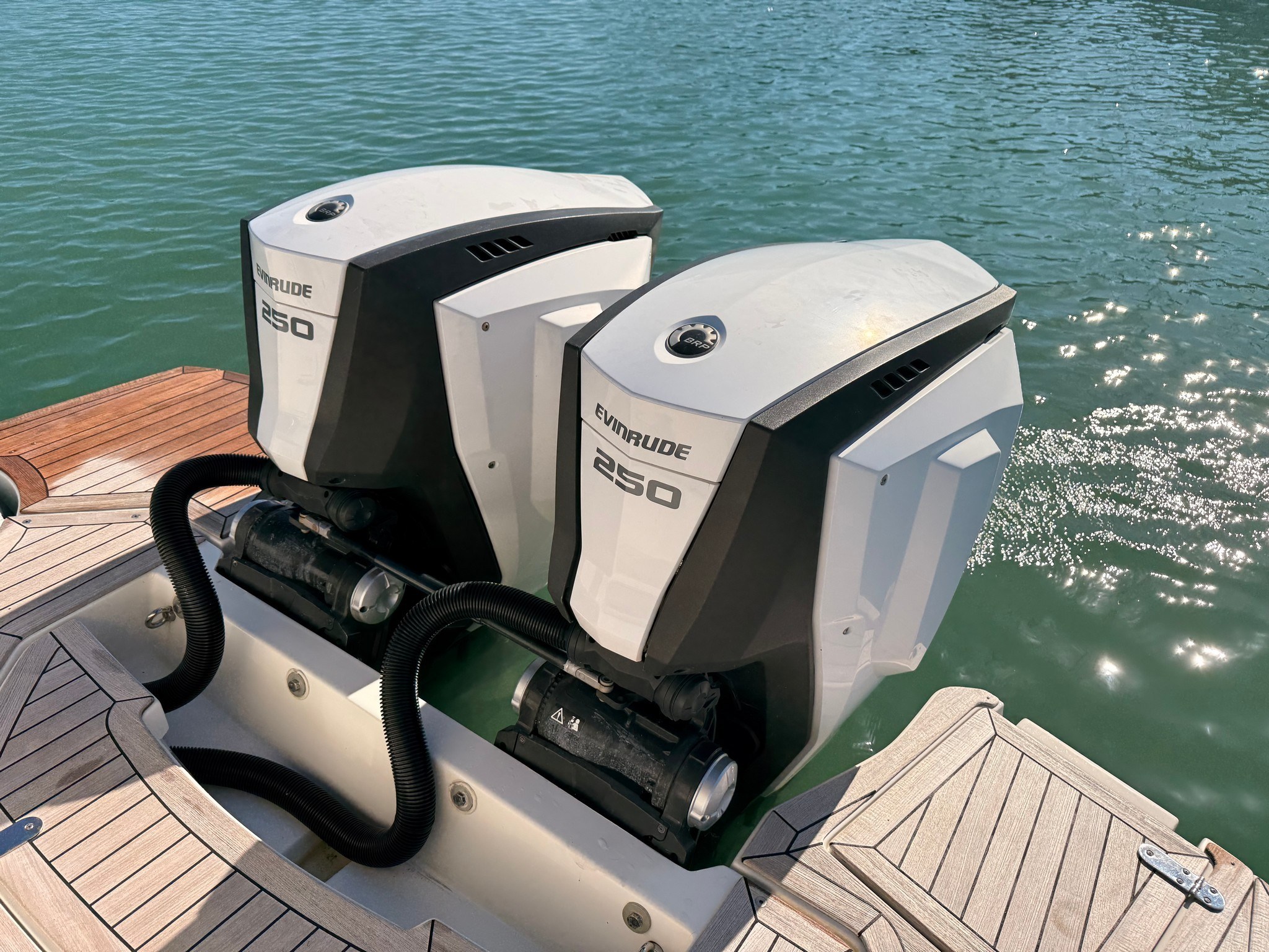 Thanks to the 250 HP twin Evinrudes, the Marlin 298 reaches speeds of over 45 knots, offering brilliant and precise navigation.