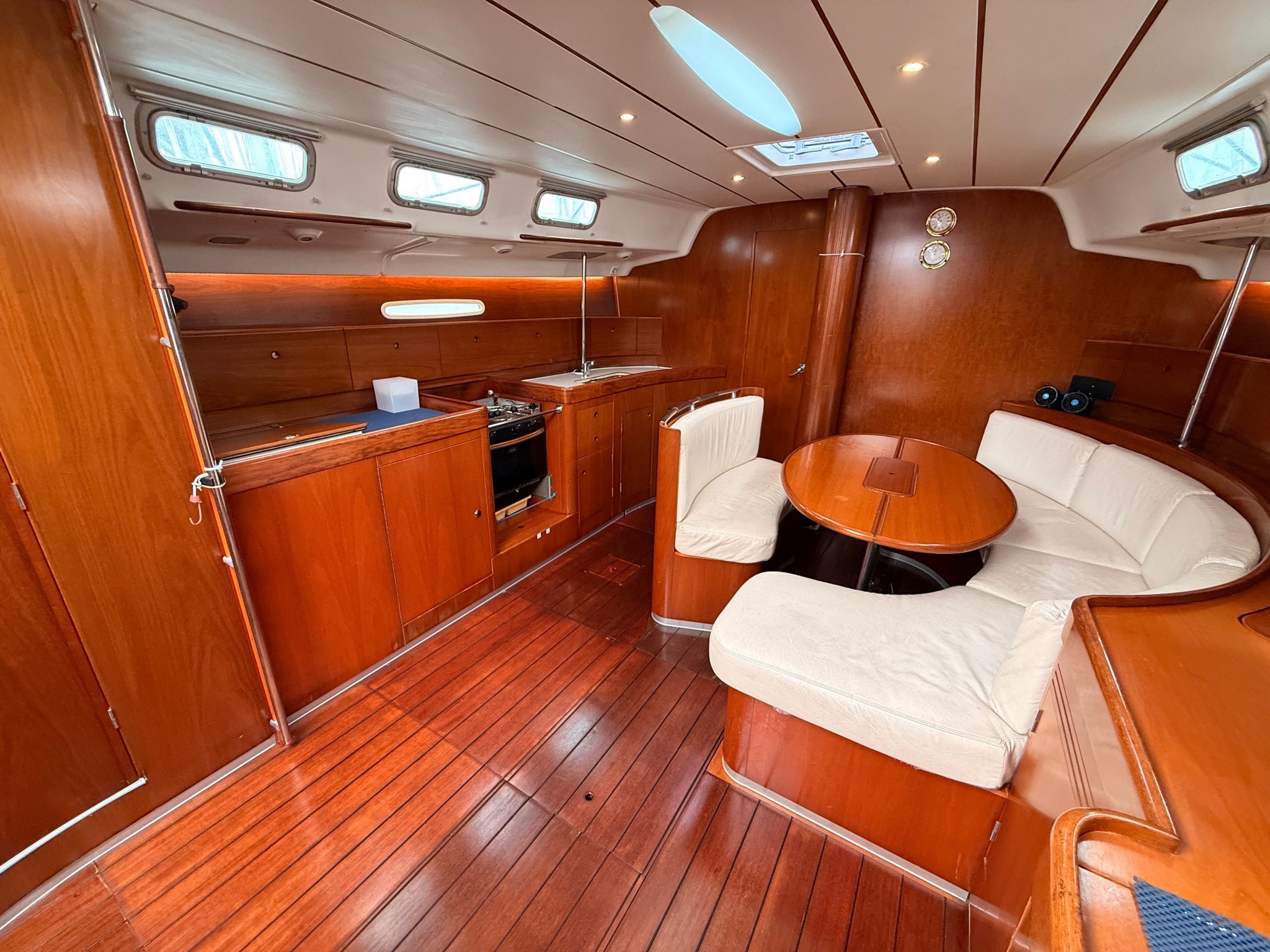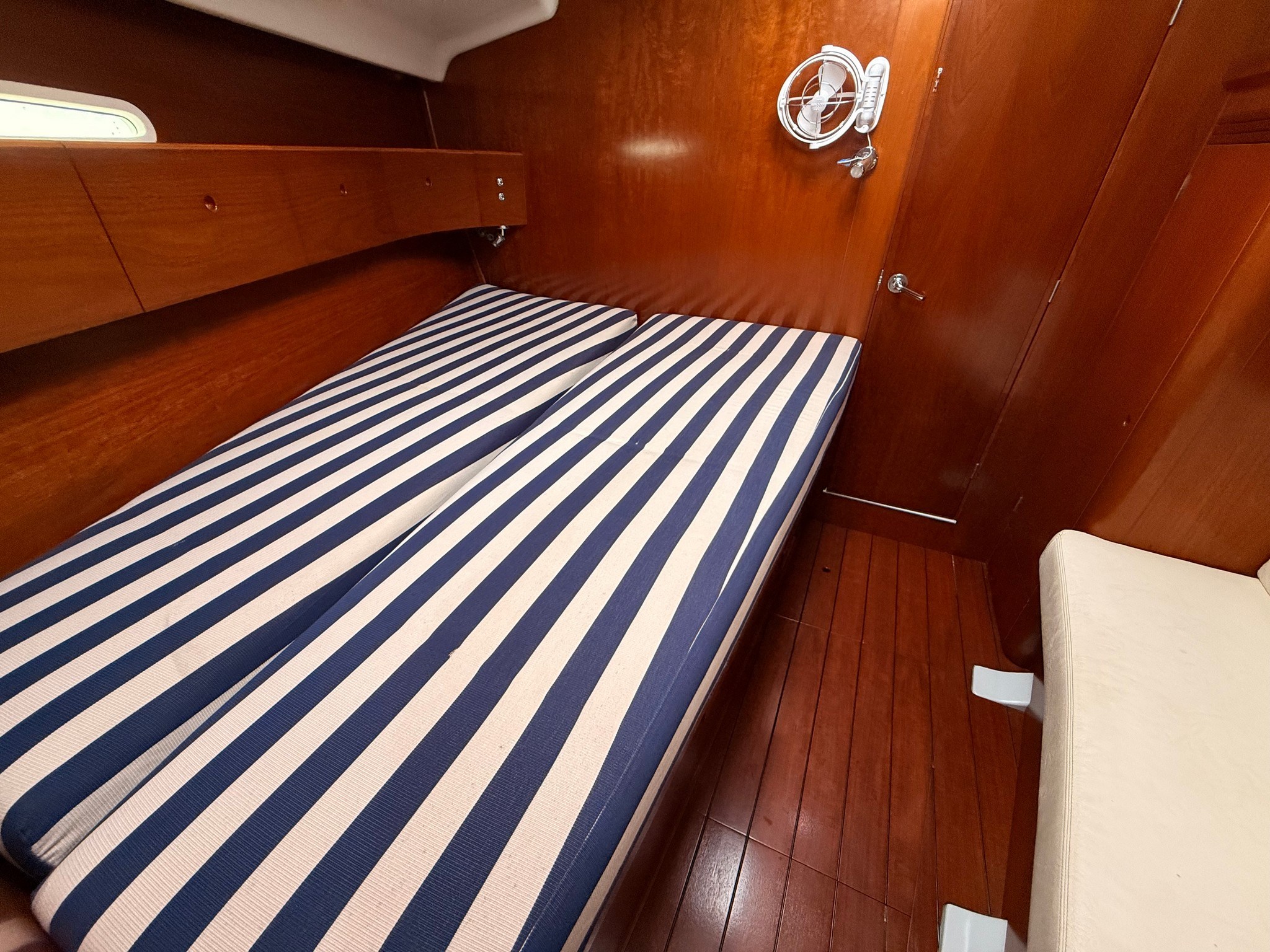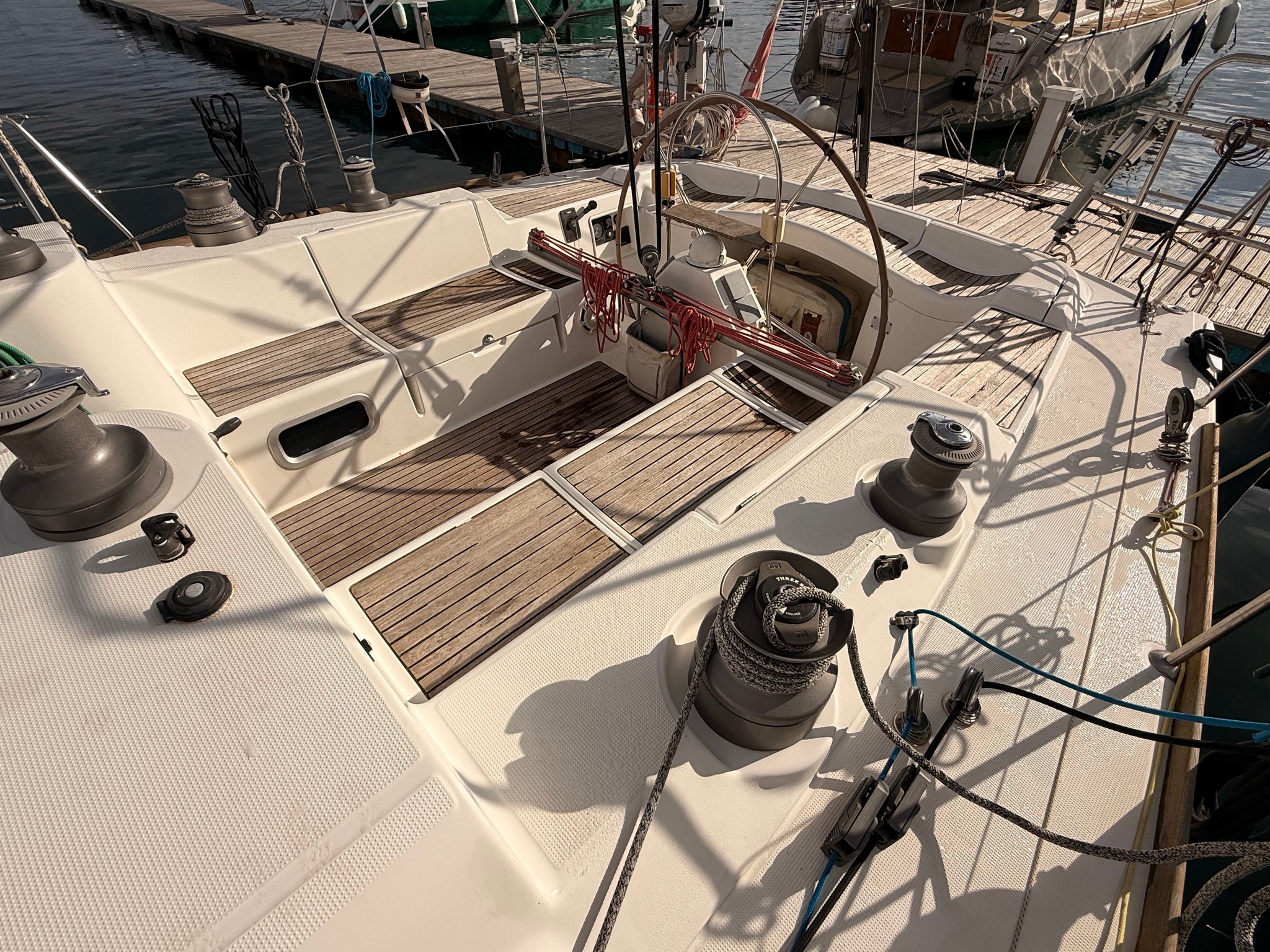 Anchor Batteries (4x 140 Ah) Battery charger Bilge Alarm Deck Shower Electric Bilge Pump Electric Windlass Entry door Fenders Gangway Living Room Foldable Table Manual Bilge Pump Rod rigging (2020) Shore power cable Shorepower connector Spare shaft swimming ladder Teak Cockpit Water pressure pump Winch Winch Electric |