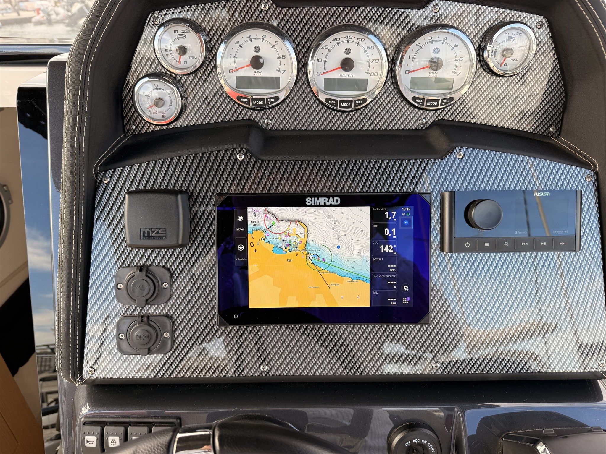 The on-board equipment is very rich: complete teak, electric table in the cockpit that can be transformed into a sundeck, complete Simrad electronics, autopilot, inverter, Fusion stereo system with 6 speakers, external refrigerator, electric toilet and numerous other accessories.
