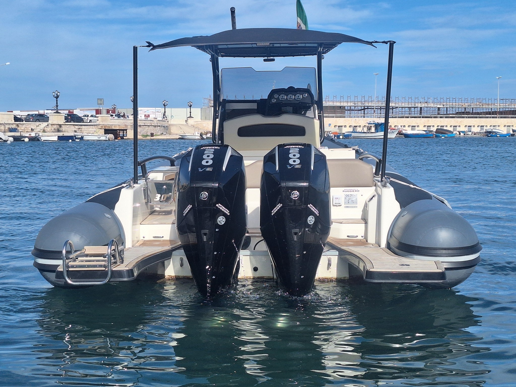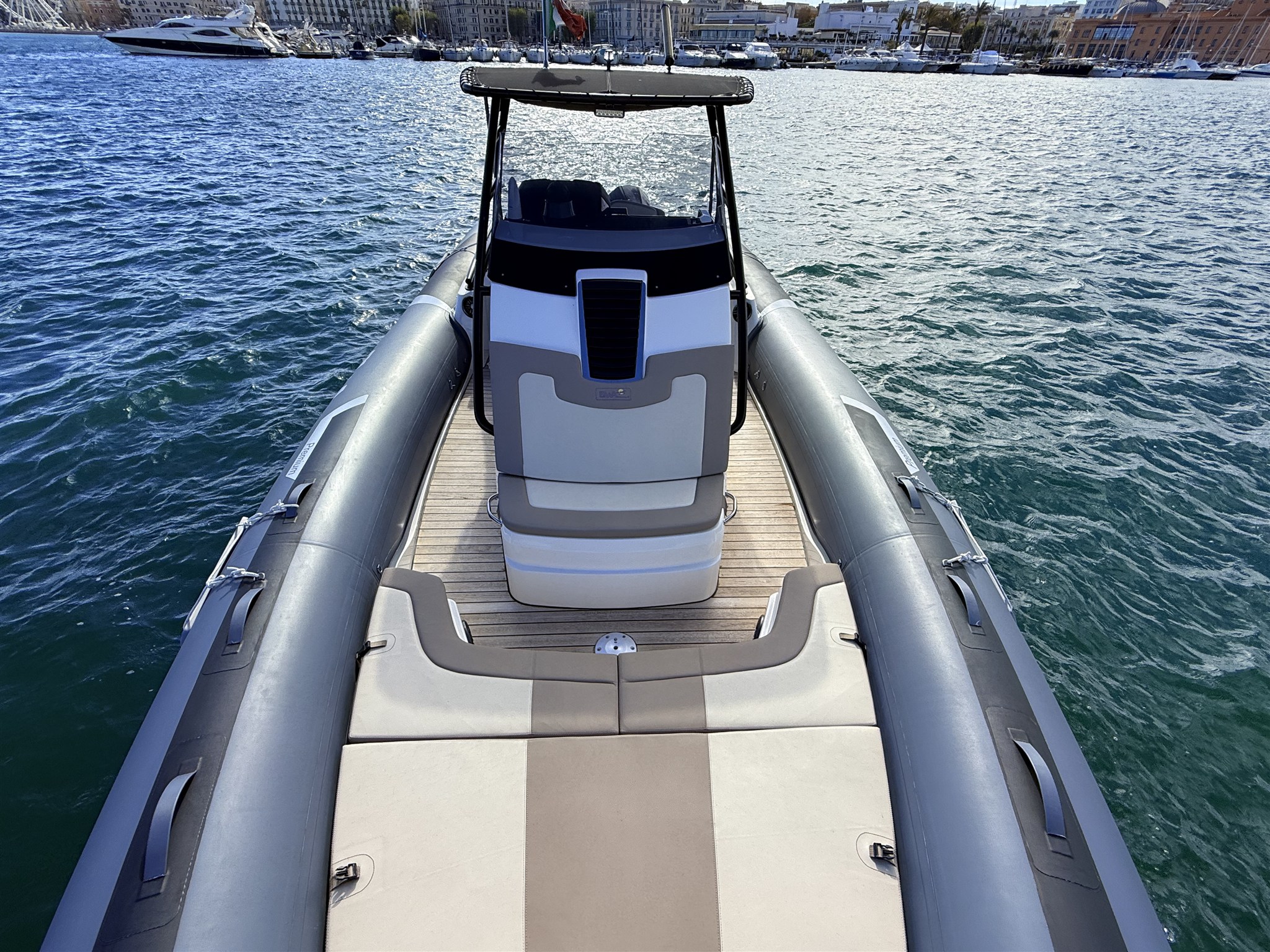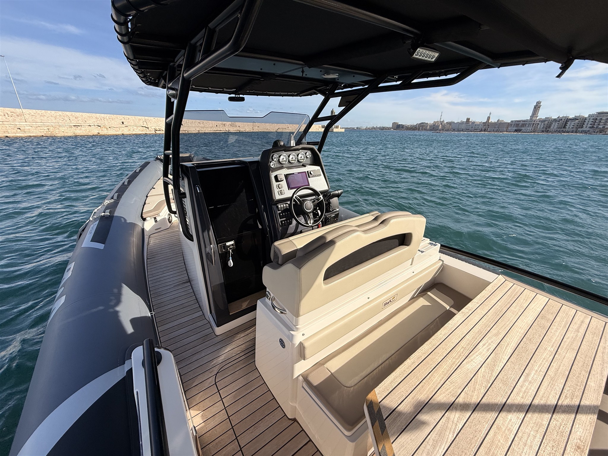Boat with a sporty and elegant look, in Full Optional configuration, with high-impact equipment thanks to the Impression gray tubulars and the beautiful total black T-Top. Designed to offer comfort, style and performance, it is the ideal solution for those looking for a recent, complete and ready-to-use boat.