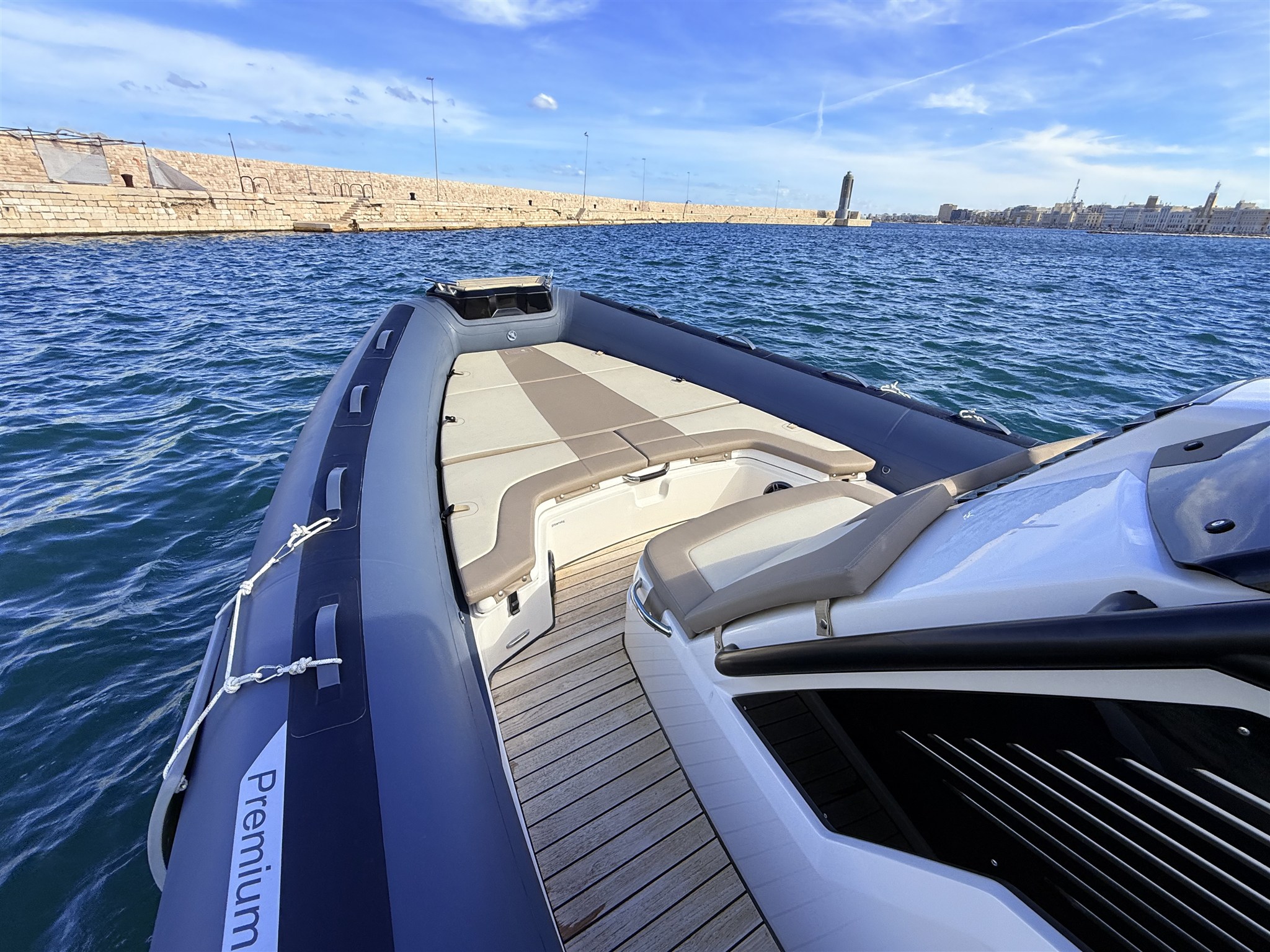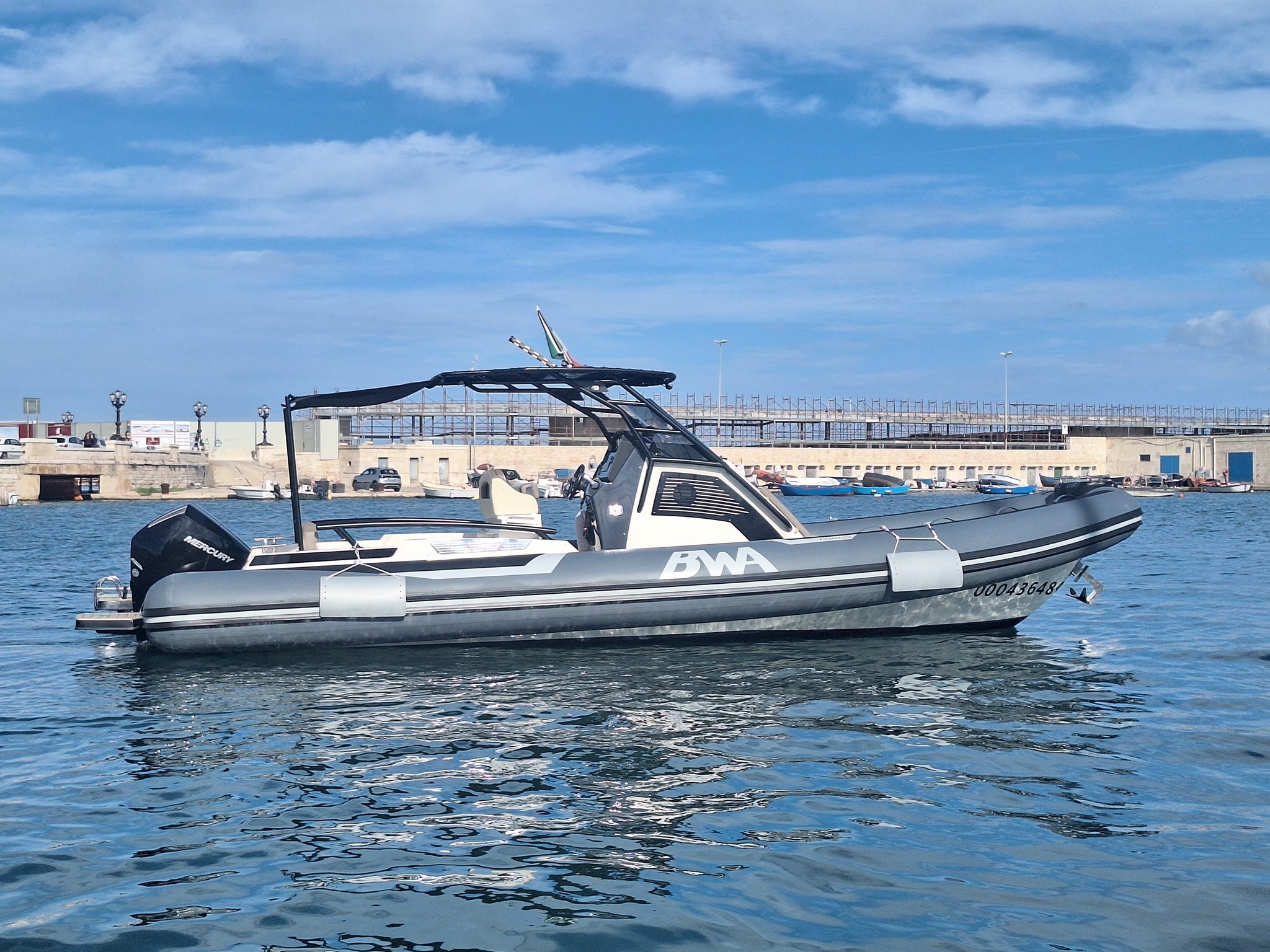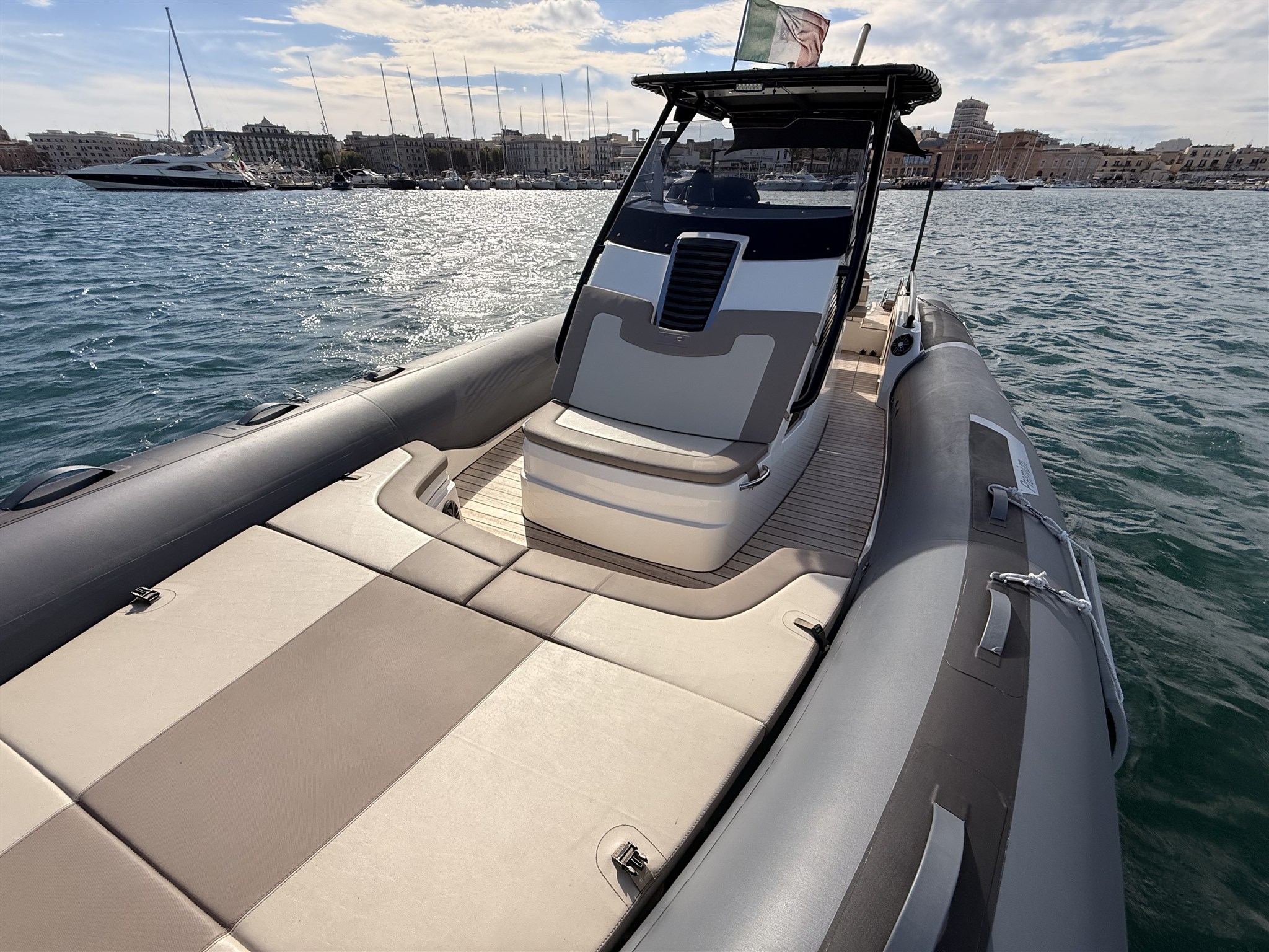 Boat with a sporty and elegant look, in Full Optional configuration, with high-impact equipment thanks to the Impression gray tubulars and the beautiful total black T-Top. Designed to offer comfort, style and performance, it is the ideal solution for those looking for a recent, complete and ready-to-use boat.