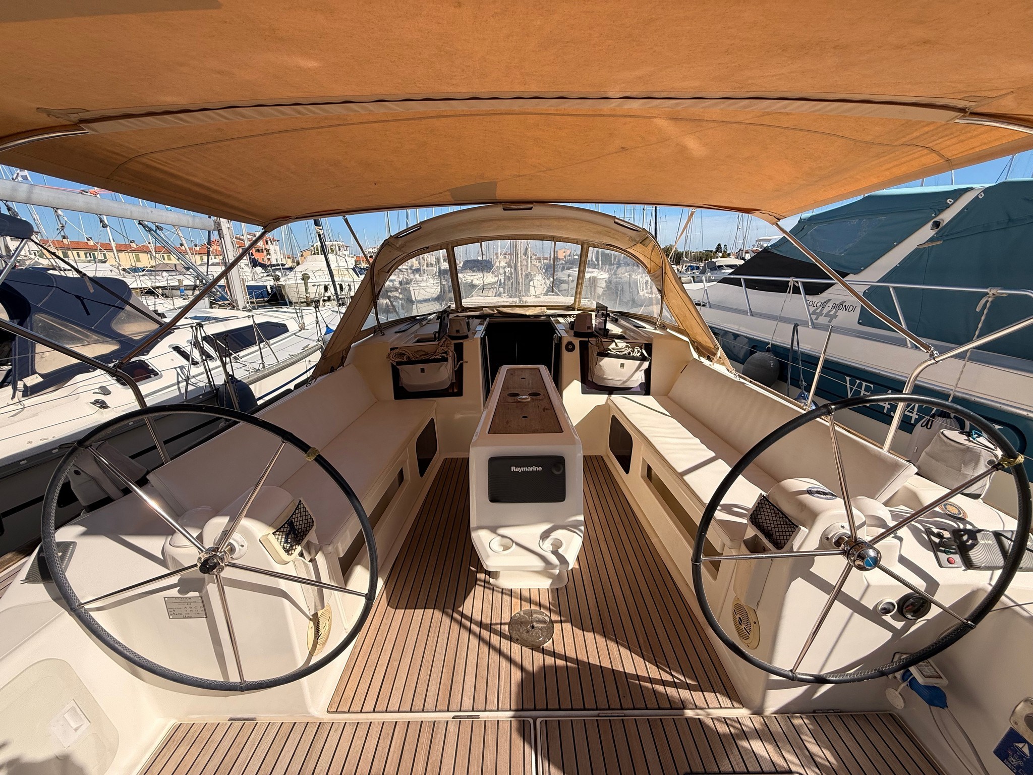 Versione 3 cabine e 2 bagni, interni luminosi e ben curati, grande pozzetto con doppia timoneria e plancetta di poppa abbattibile.