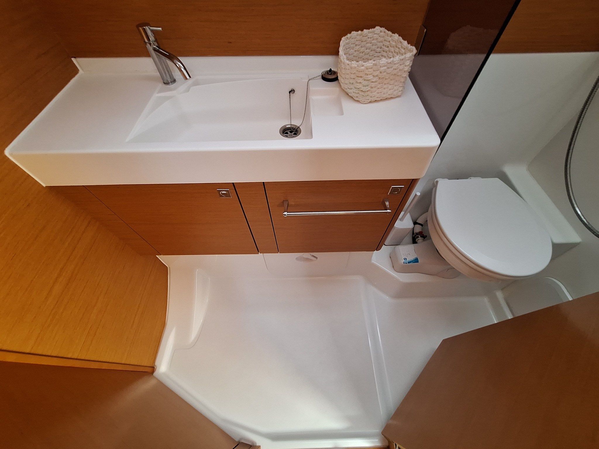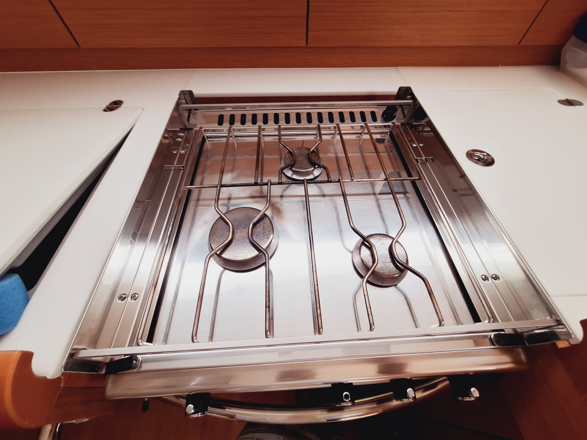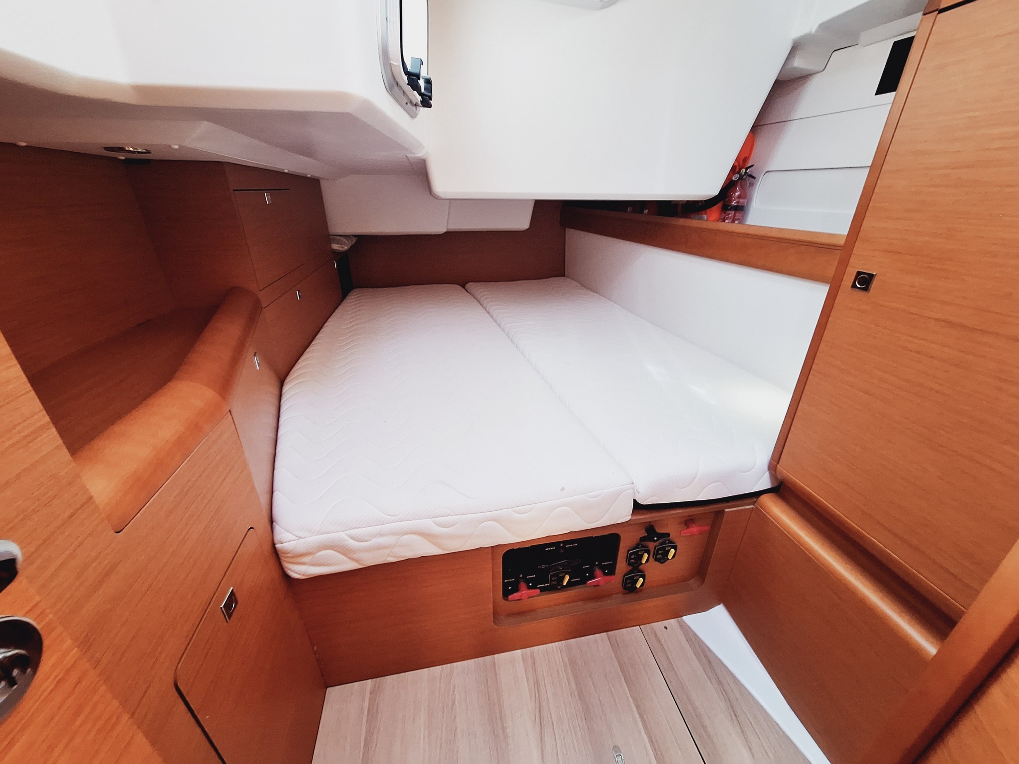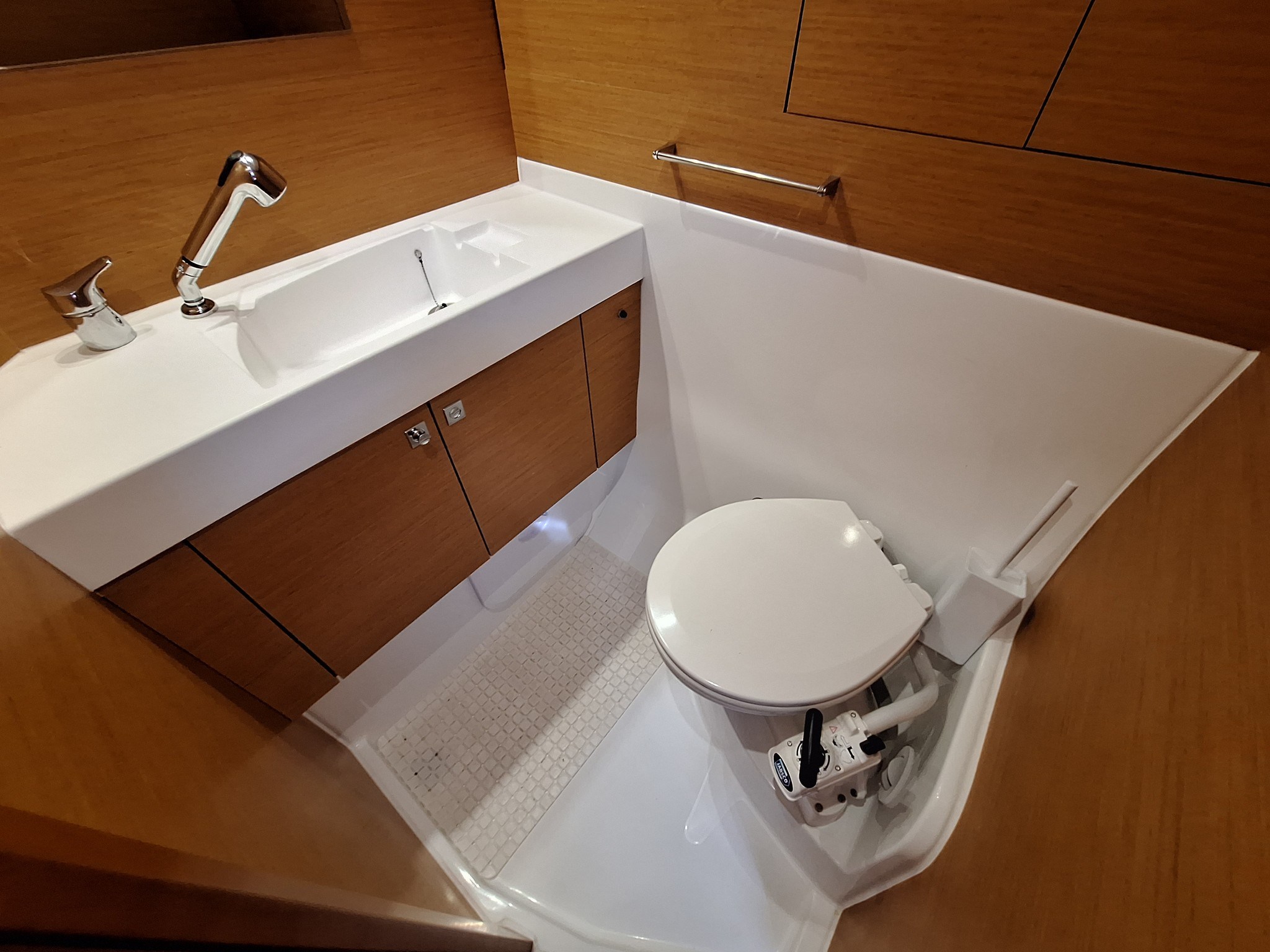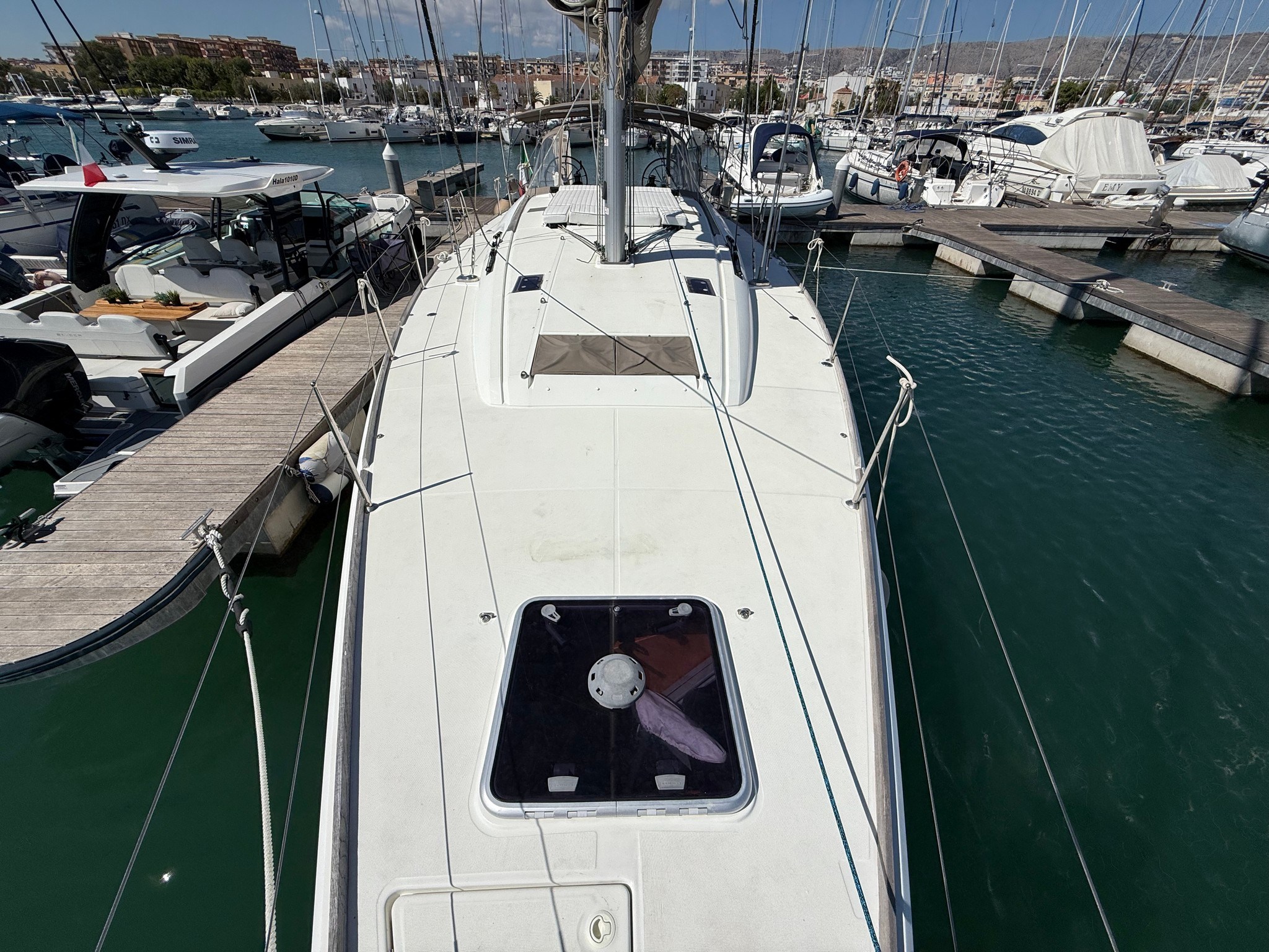 Motorizzata Yanmar 80 HP (circa 1.400 ore) e completa di generatore Onan 7,5 kW, elica di prua, winch elettrico, passerella idraulica e piattaforma di poppa elettrica. Coperta in teak e vele avvolgibili rendono la gestione semplice e sicura anche in equipaggio ridotto.
